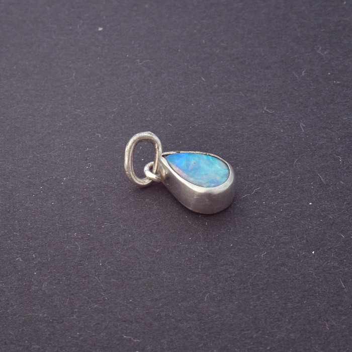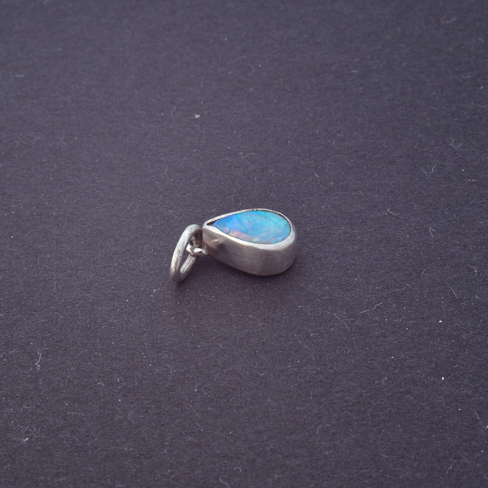 Ein handgefertigter Tropfen aus Silber und Opal, der das Licht einfängt, das zwischen Himmel und Meer tanzt.