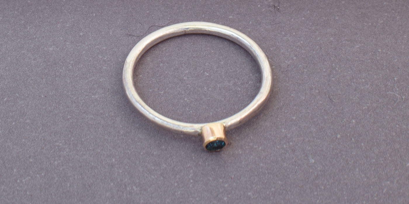 Mit einer Ringstärke von etwa 1,5 Millimetern und einem Stein von rund 3 Millimetern Durchmesser wirkt der Ring filigran, aber präzise gearbeitet. Das Zusammenspiel von Silber und Gold, von kühlem Metall und warmer Fassung, spiegelt das Gleichgewicht von Meer und Sonne wider.